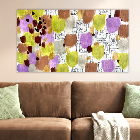 Questo dipinto originale unisce la morbidezza dei colori pastello alla dinamicità delle grafie, perfetto per ambienti moderni che cercano un tocco di eleganza